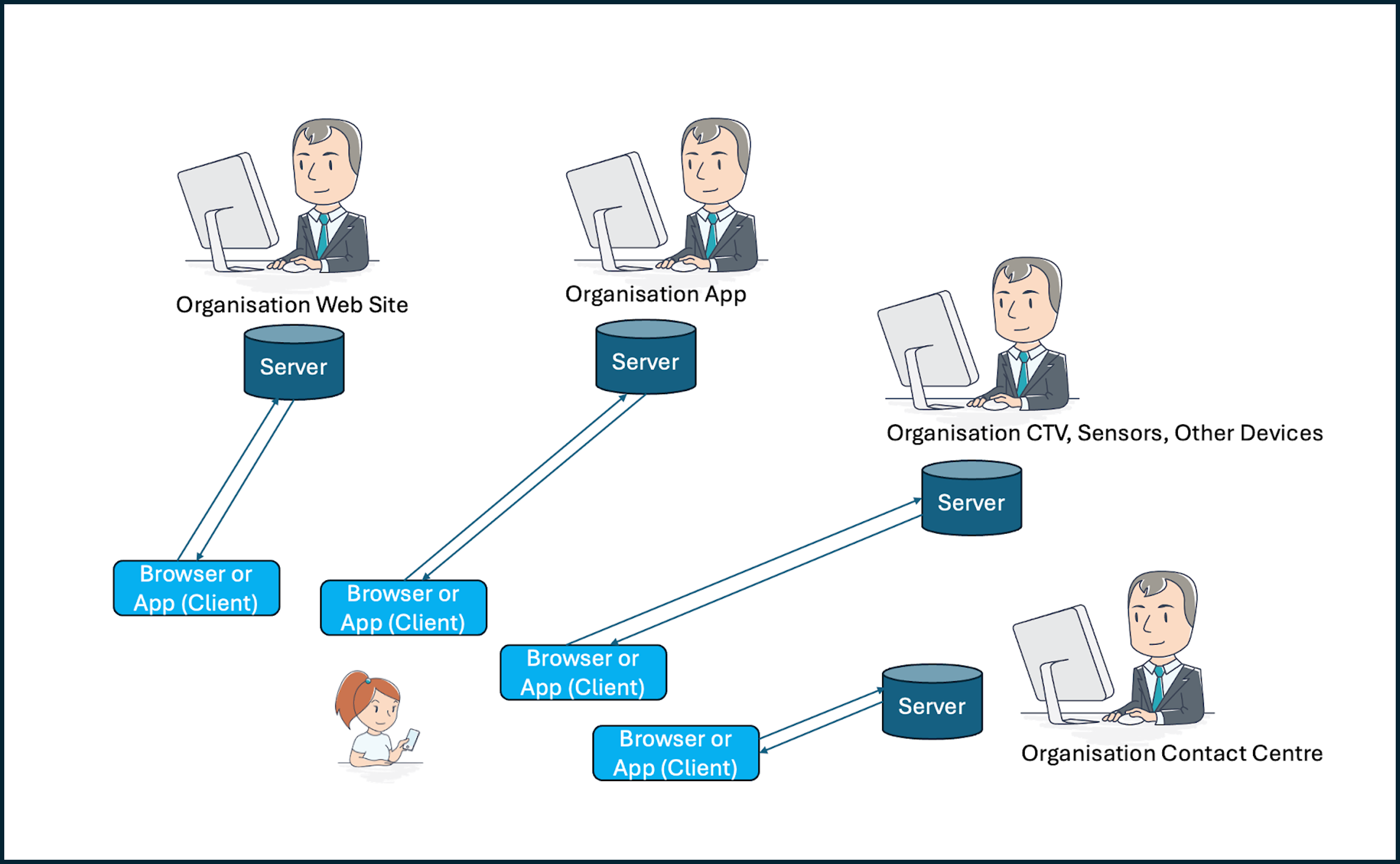 In a client–server model, the organisation runs the server. The individual connects via a client — usually a browser or mobile app.
