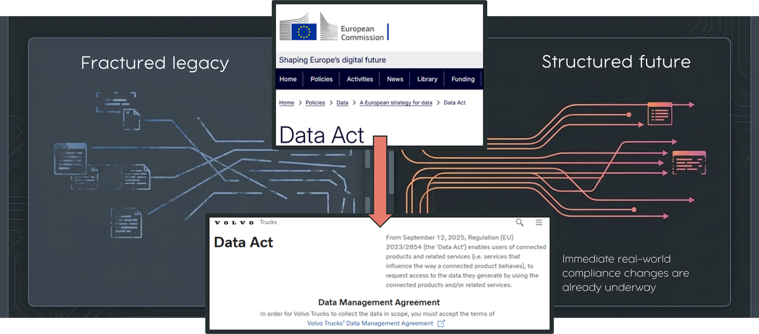 The legislative hammer. In Europe, the Data Act completely changes the directional flow of data rights. It fundamentally strips unilateral data authority away from the manufacturer and redistributes it directly to the driver.
