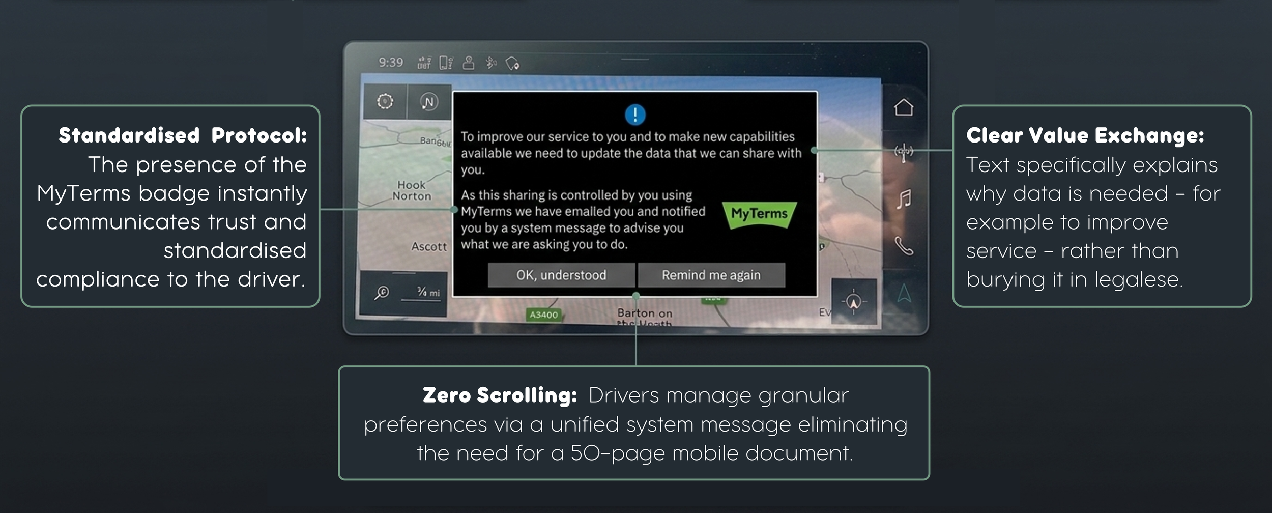 Now, as those terms are updated by the manufacturer, messages like this start appearing. The interface doesn’t offer a meaningful choice—only the option to review. And the prompt persists, appearing every time the vehicle is started, until someone—anyone using the vehicle—clicks “Yes”.