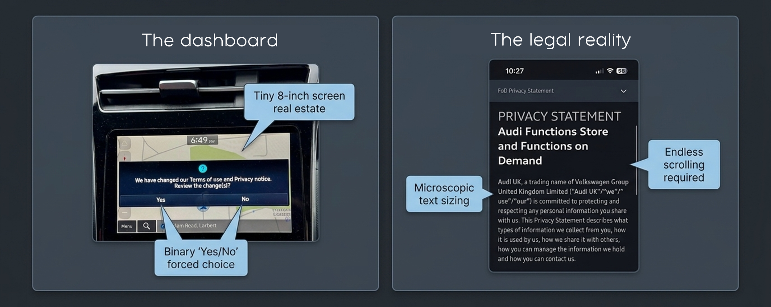 As one example, try reading the privacy terms for an Audi vehicle in the UK on your phone. You’ll be scrolling… and scrolling… and scrolling again. Twenty-plus screens’ worth.